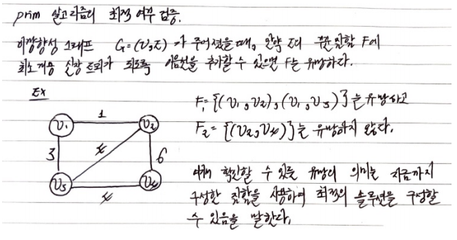 따라서 정리해보면 Prim 의 알고리즘에서 구성되는 각 단계의 F 들이 유망함을 보이면 최적임을 보일 수 있다는 것이다.
