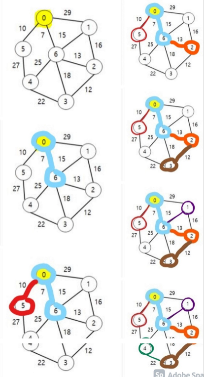 - 앞 단계에서 만들어진 MST 집합에 인접한 정점들 중에서 최소 간선으로 연결된 정점을 선택하여 트리를 확장한다. (가중치가 가장 낮은 것을 먼저 선택한다.)